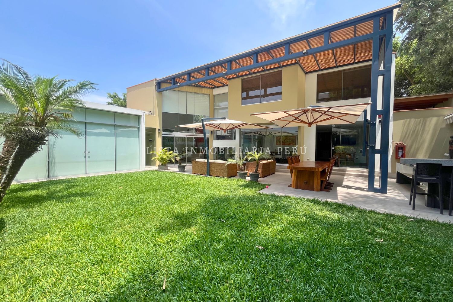 Casa con techos doble altura, 5 dormitorios, sala, comedor, cocina cerrada con isla, jardín y piscina con cascada.Ubicada en calle cerrada con vigilancia