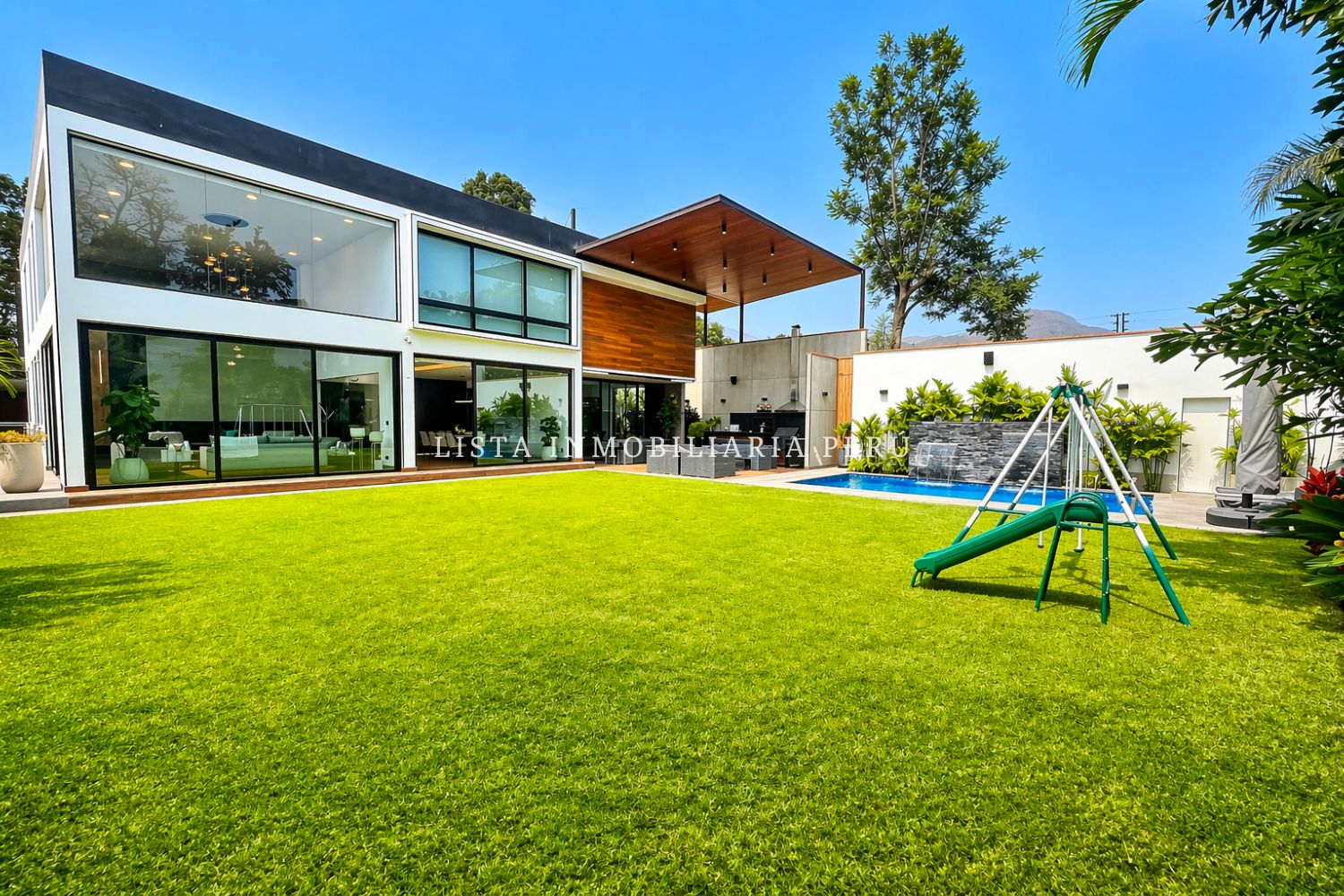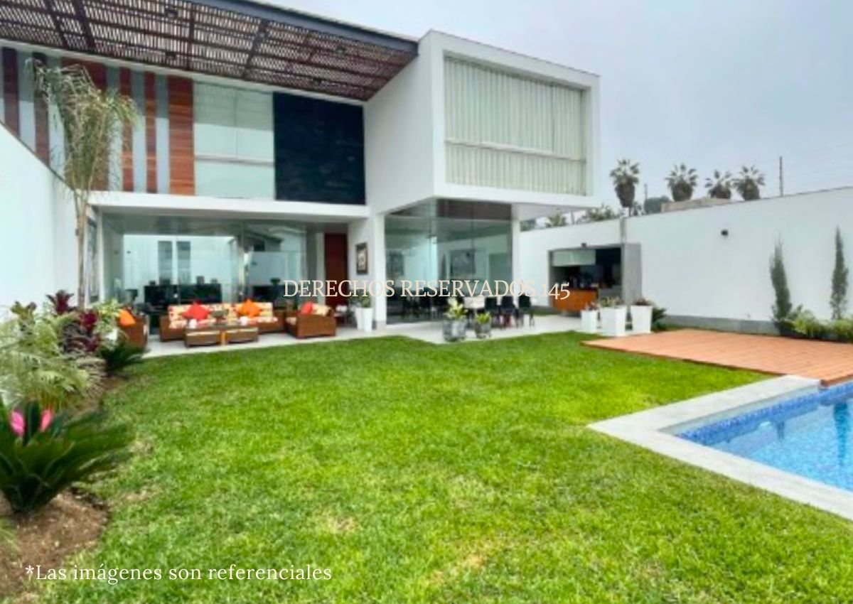 Casa con techos doble altura, 5 dormitorios, sala, comedor, cocina cerrada con isla, jardín y piscina con cascada.Ubicada en calle cerrada con vigilancia