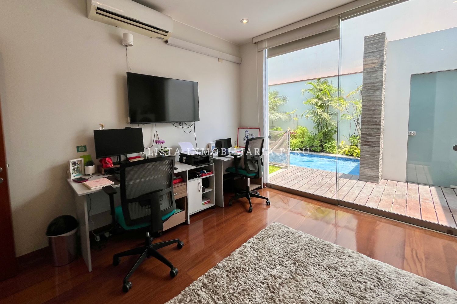 Hall de ingreso con techo doble altura, baño de visitas, sala, comedor principal con techos altos, escritorio con salida a la terraza.