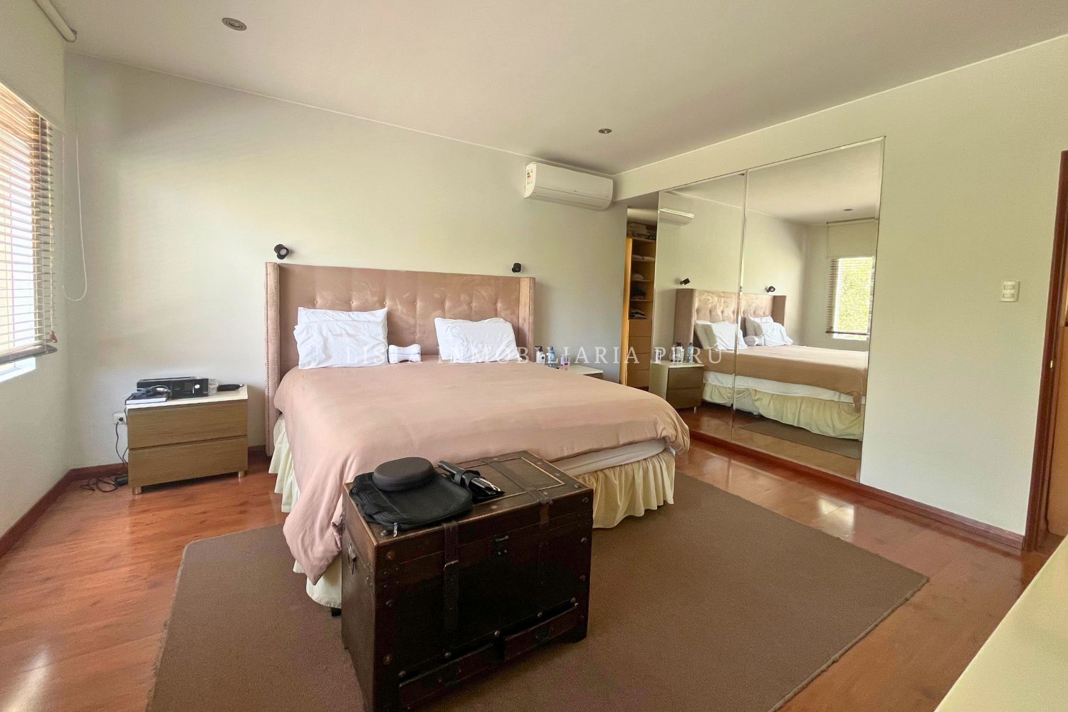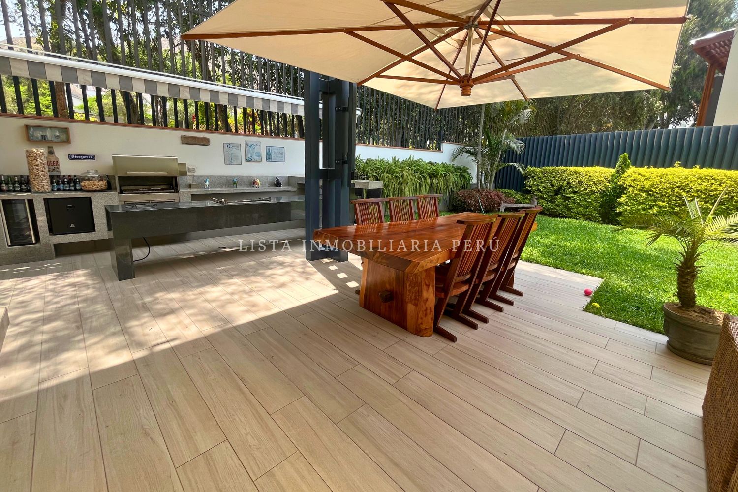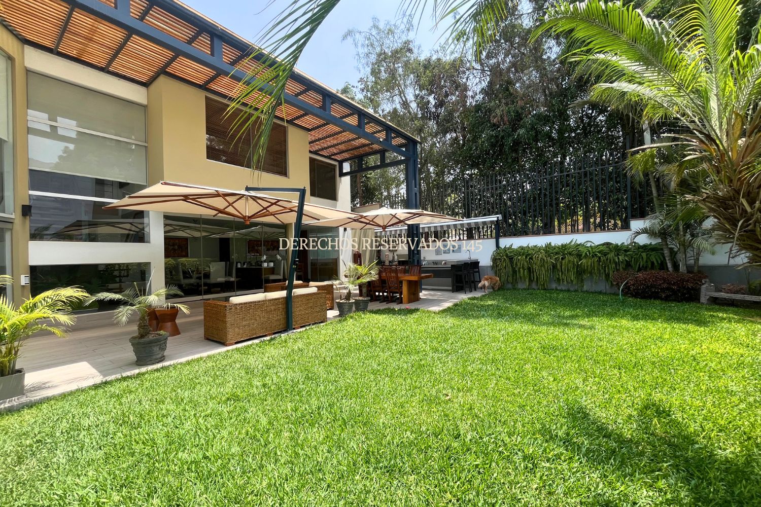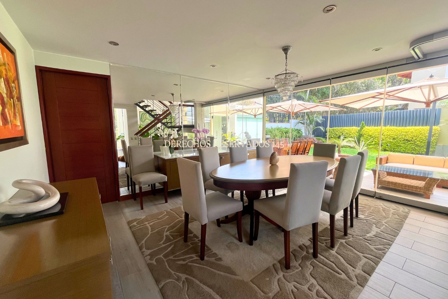 Primer piso: Hall de ingreso, techos doble altura, sala principal, comedor principal, cocina cerrada con comedor de diario, sala de estar, baño de visitas.Amplia terraza con área de BBQ, lindo jardín.Gimnasio con baño incorporado, posible 5to dormitorio.4 Estacionamientos en paraleloÁrea de servicio: Cuarto y baño de servicio, patio, lavandería